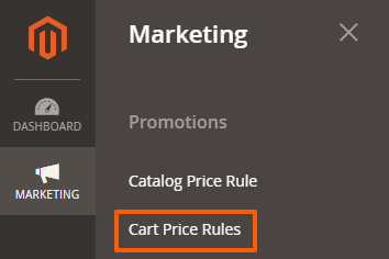 - Log in to the Admin Panel: Navigate to Marketing > Cart Price Rules under the Promotions section.