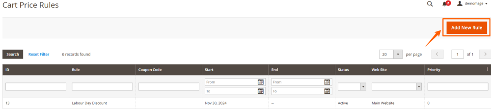 - Create a New Cart Price Rule: Click on Add New Rule.