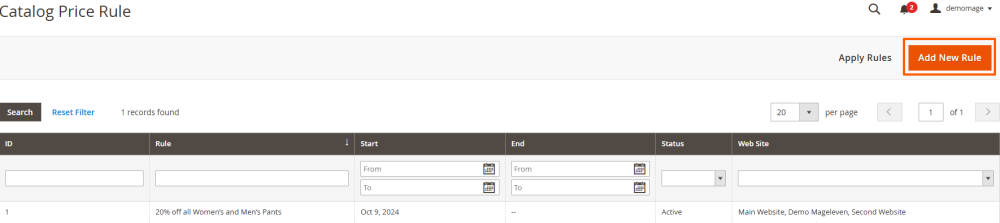 - Log in to the Admin Panel: Navigate to Marketing > Catalog Price Rules under the Promotions section.