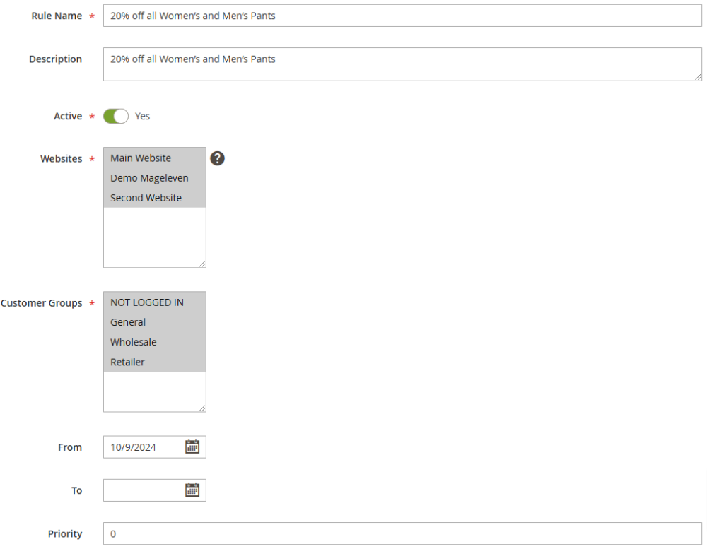 - Add labels to describe the rule, such as "10% Off Electronics," for different store views.